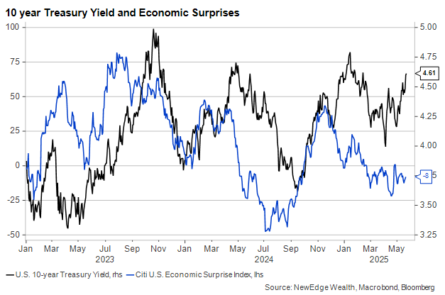 On the flip side, we must note that rates could show renewed sensitivity to incoming economic data if it begins to weaken over the summer under the weight of tariffs. As the chart below shows, rates have diverged from Economic Surprises in recent months. This could reflect the deficit concerns, but also likely reflects that most of the economic data weakness has been contained in “soft data” that has not made its way into real “hard data” yet.