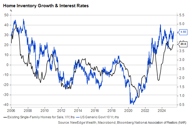 The chart below shows the impact of high rates on housing activity, with high mortgage rates keeping upward pressure on unsold home inventories. High rates are exacerbating affordability challenges, and while they likely deter some existing homeowners from selling, they have a larger impact on demand.