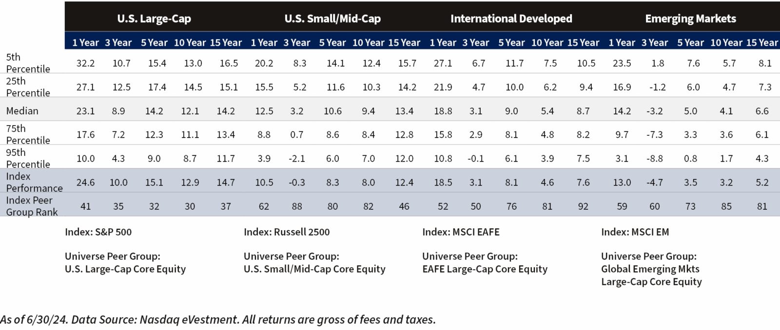 Figure 3: eVestment Universe of Active Managers – U.S. Large-Caps vs. U.S. Small/Mid-Caps vs. International Developed vs. Emerging Markets