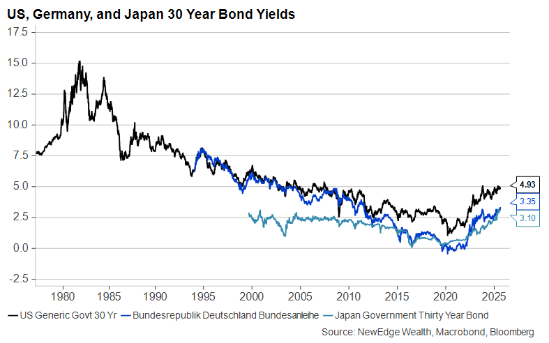 Where we are seeing more “spicy” price action is in 30-year yields around the globe, which are likely reflecting these concerns about stickier long-run inflation in addition to global debt and deficit concerns (which we frame in this recent piece about bond market supply and demand).