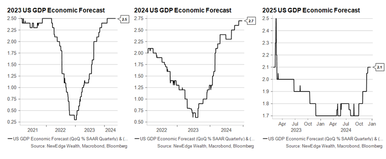 Growth estimate revisions higher have been the underpinning driver of the bull run in equities and credit over the last two years. As the charts below show, annual GDP being revised from 0.25% to 2.9% (final figure) over the course of 2023 and 1% to 2.7% over the course of 2024 has been a key reason why equities and credit have staged such powerful rallies.