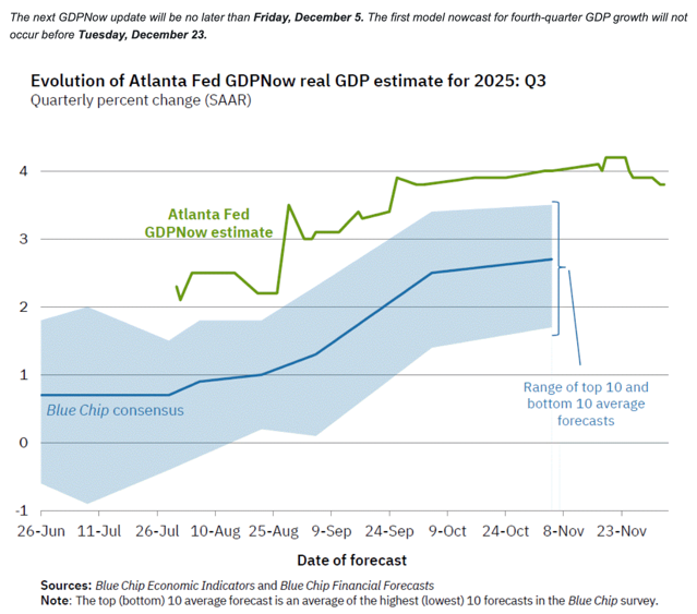 The 2% GDP growth forecast likely reflects uncertainty as much as it does confidence, as key swaths of data from the last few months are still missing thanks to the government shutdown. We can see this with Atlanta Fed GDPNow forecasts, which are still on 3Q25 estimates (at a whopping 3.8%!) and won’t switch to forecasting 4Q25 until December 23, effectively taking the “now” out of “nowcast”. Thus, a 2% target may just be a proverbial placeholder.