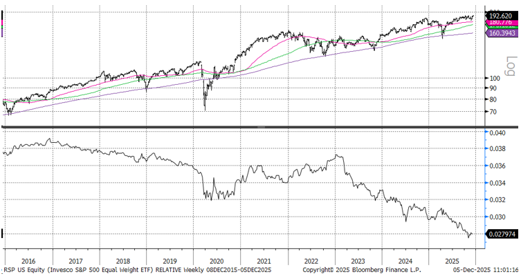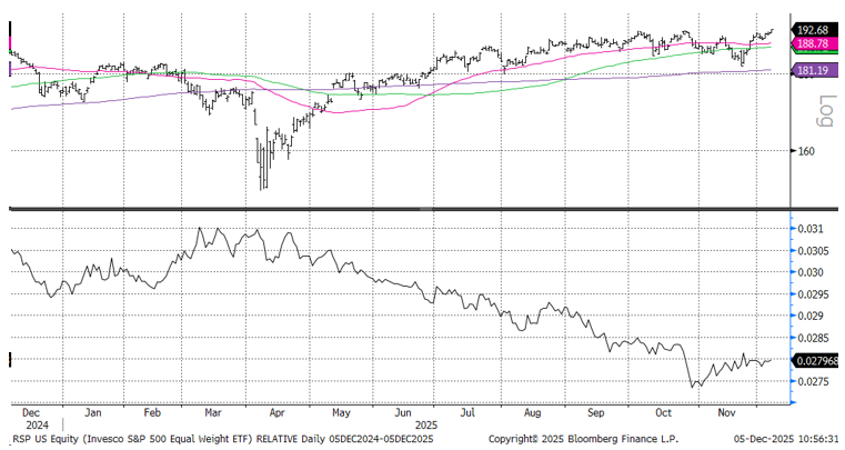 The continued earnings decline in the Equal Weight index is not stopping the annual rallying cry for a “broadening out” of market leadership away from Mag 7, and it appears that some investors are putting their money where their mouth is, with the Equal Weight S&P 500 eking out a new high this week and seeing a slight improvement in its relative performance, as shown below.
