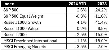 Contrary to the many calls for leadership rotations and a broadening out of the market, 2024’s market dynamics has been more of the same: Growth/Technology leads, while Value/Equal Weight/Small Cap/Non-U.S. lags.