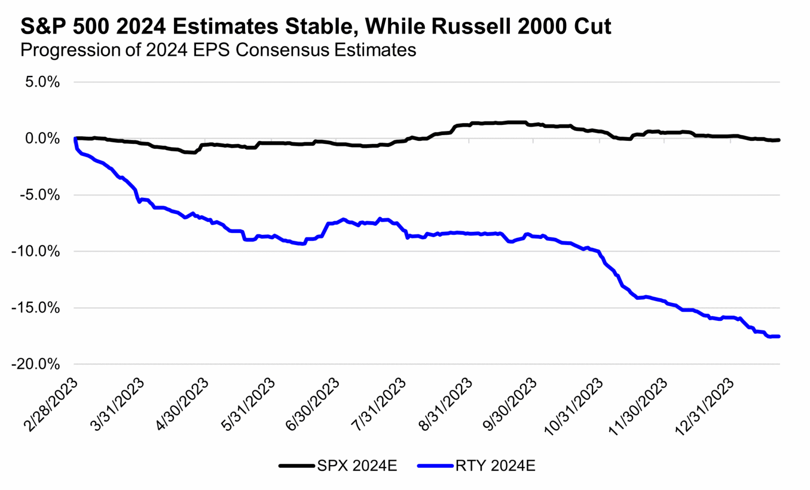 Different parts of the market have truly gone separate ways when it comes to earnings revisions, and we think a change in these earnings revision trends is likely necessary to see a change in stock market leadership as well, making these must-watch metrics. The starkest example of earnings revisions driving relative performance is with small cap stocks, where over the last year, analysts have cut estimates for Russell 2000 2024 EPS by 20%, while S&P 500 EPS estimates have seen little change. In this same timeframe, the S&P 500 outperformed the Russell 2000 by 20%.