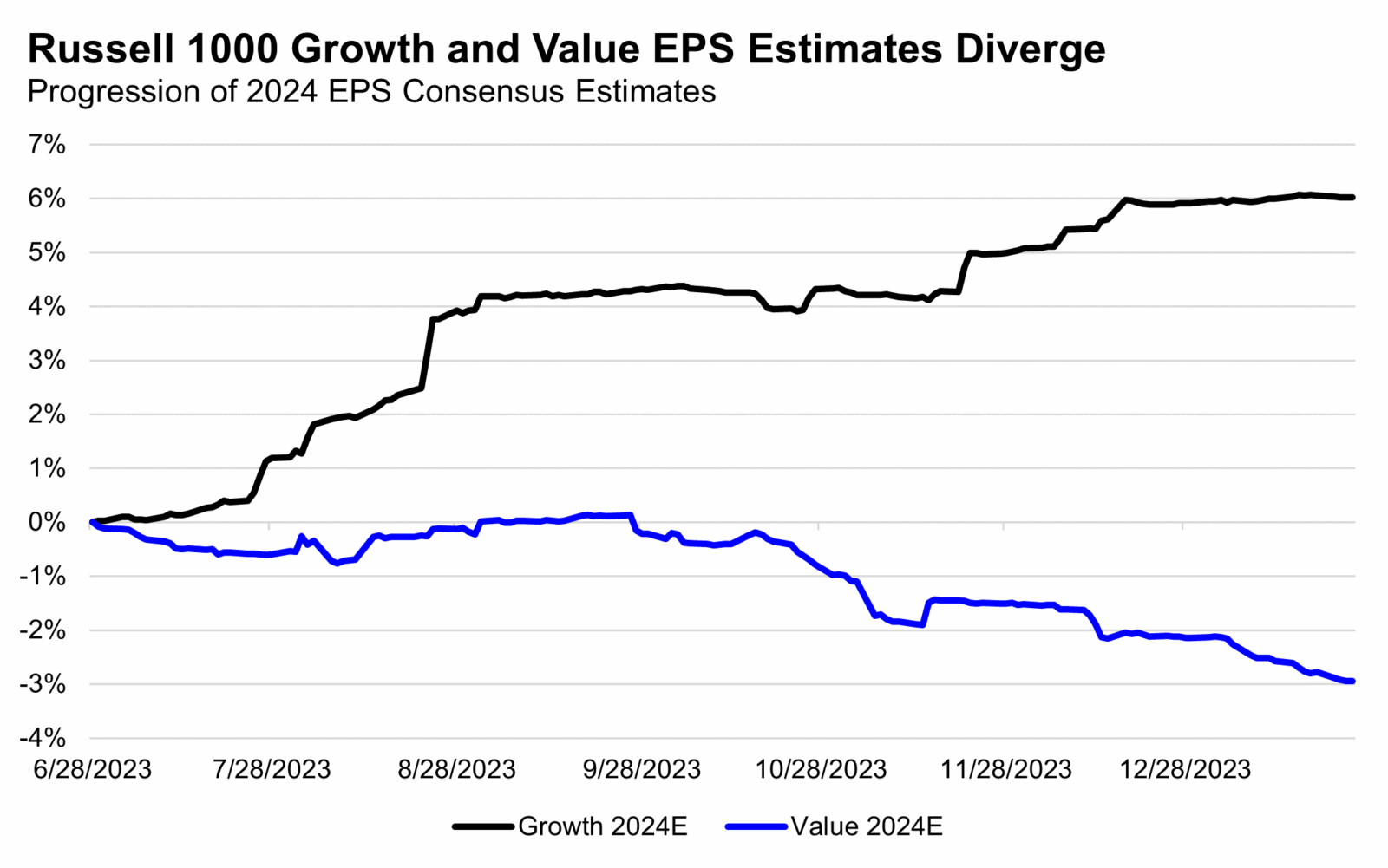 Though strong rallies in broad equity market indices to start 2024 are hardly wince-inducing like Journey’s music video, under the surface, we have continued to see a stark divergence between market leaders and laggards, with a notable continuation of 2023’s leadership profile to start 2024. We think this performance is due to earnings revisions going separate ways.