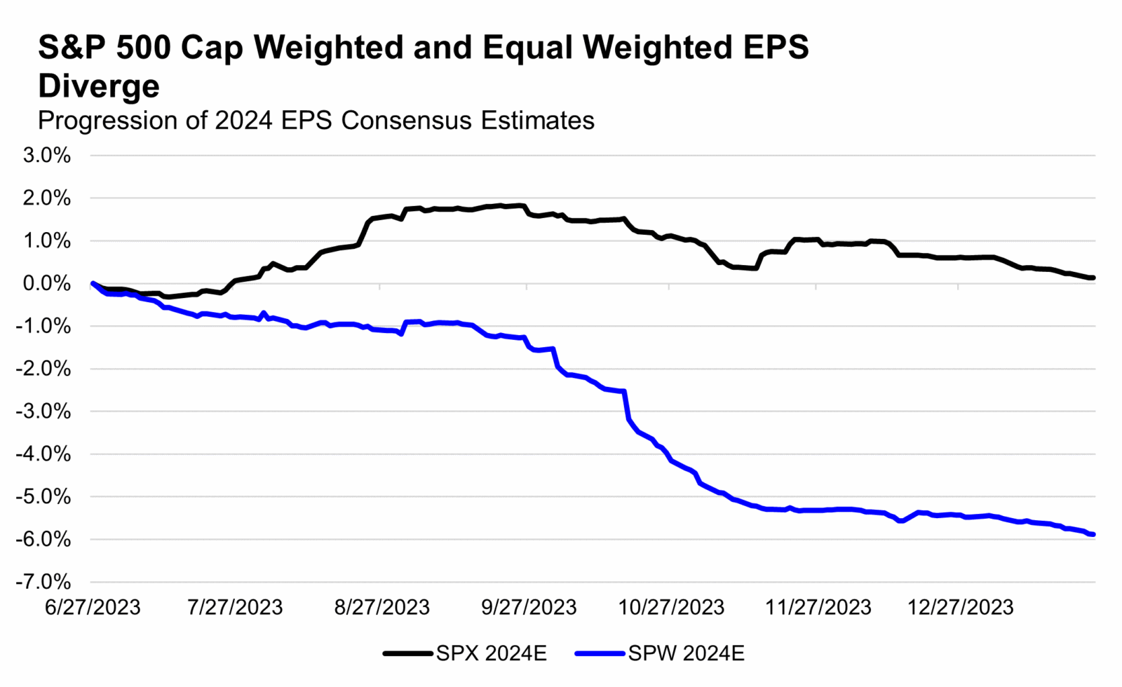 For those hoping for a broader market in 2024, with better performance of the Equal Weight S&P 500, the separate ways dynamic of EPS revisions is relevant as well. As cap weighted S&P 500 EPS revisions have remained flat over the last 7 months, the Equal Weight S&P 500 has seen its 2024 EPS estimates get trimmed by -7%.
