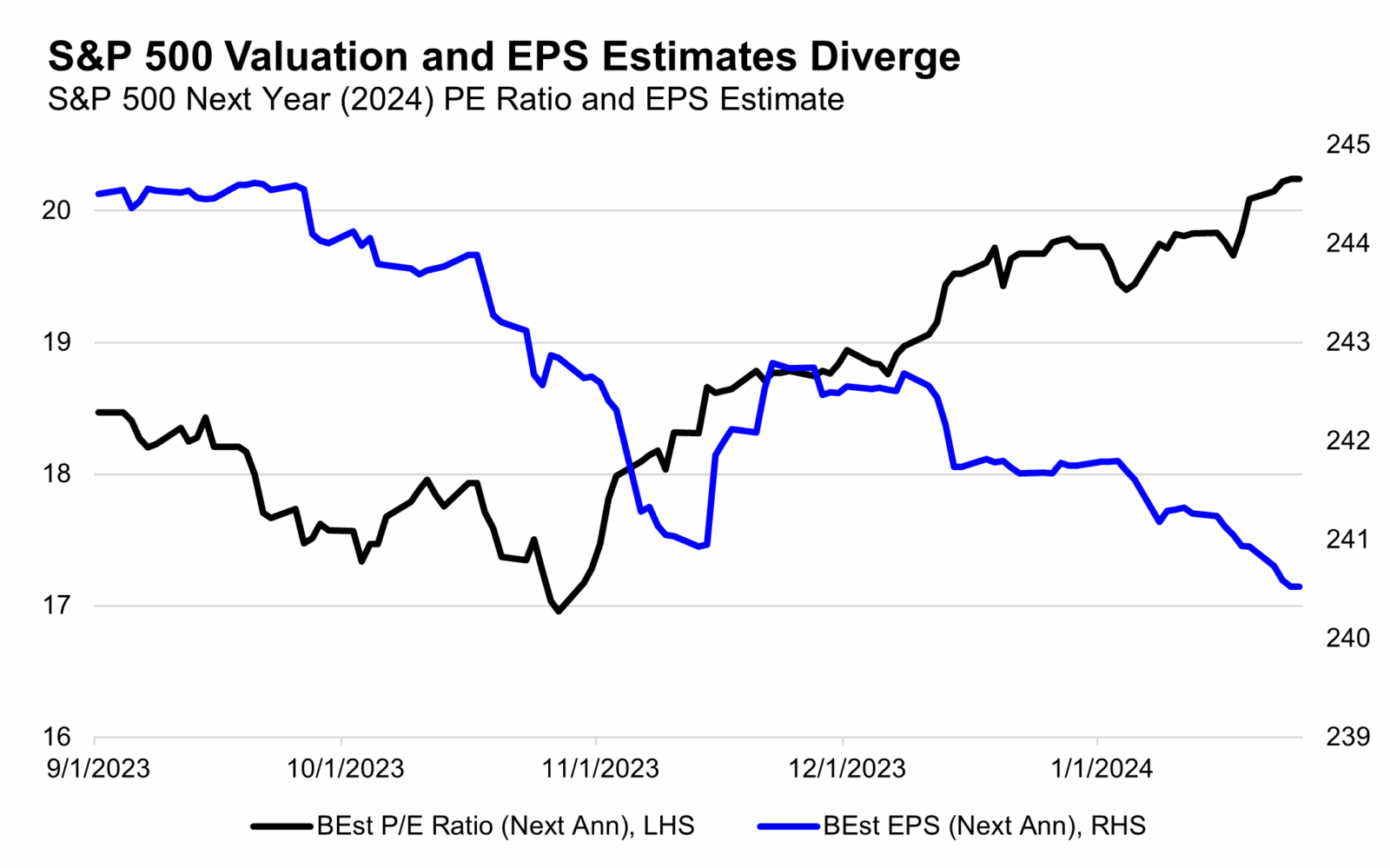This downward pressure on EPS estimates, though slight, is interesting in the context of economic forecasts that have been revised meaningfully higher (look at this week’s 3.3% 4Q24 GDP vs. 2% estimates!) and growth sentiment that has improved materially in this same four-month time period (consensus is now for “soft landing nirvana”).
