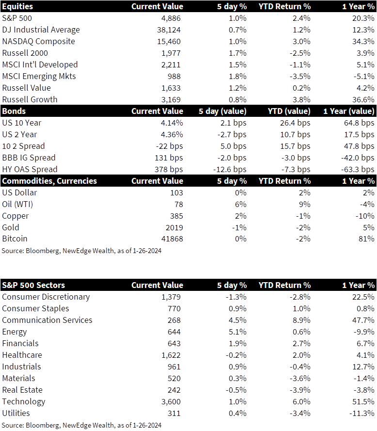 9. The Week Ahead – Thebiggest event for markets next week is the two-day FOMC meeting that begins on Tuesday. Markets have effectively priced out any chance of a rate cut at this meeting, but Powell’s comments during Wednesday’s press conference are sure to be closely parsed. Beyond the Fed meeting, major economic announcements next week include January Consumer Confidence figures, December ADP employment data, January Manufacturing PMIs, and to cap off the week, the January Employment Situation Summary report from the BLS (more colloquially known as “Jobs Friday”).
