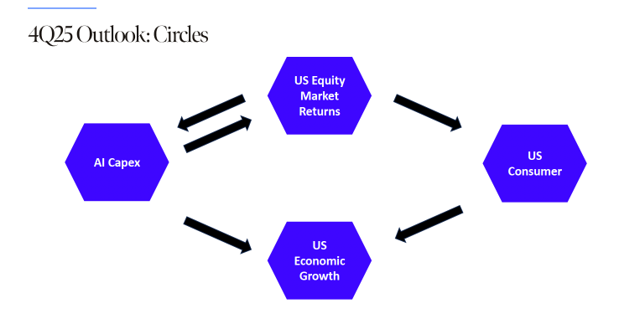 This last point is vital and was the focus of our 4Q25 outlook, which we titled “Circles”, not just in reference to the circular financing of AI deals, but also the circular relationship between AI capex, the US economy, the US consumer, and US equity markets.
