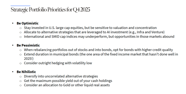 This is a time for markets that is equally complicated and fascinating. The current snapshot is near record valuations for equity and credit, positioning that is chasing returns, sentiment that has become ebullient, widespread optimism about growth, and a massive circular and interconnected technology capex cycle that is seemingly justifying the rest of this snapshot. This snapshot could a high bar for markets to jump over, mostly as we enter 2026, a dynamic that we will be watching and analyzing closely through the end of the year.