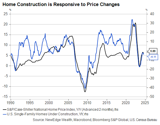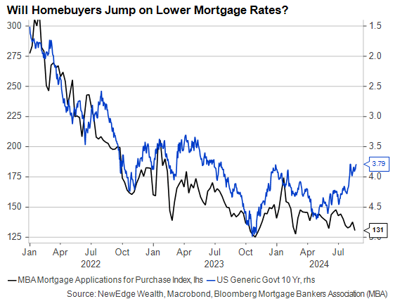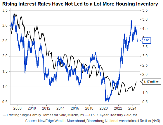 Unfortunately, increasing home supply isn’t a policy that can work overnight, and even the benefit of Fed rate cuts is likely to be muted with peak selling season receding into the rearview mirror. Even in the best-case scenario of falling rates and resilient growth, we may not get a durable pickup in home sales until sometime in the Spring of 2025.