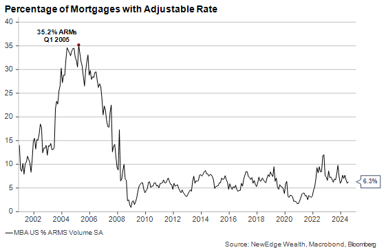 According to the latest U.S. census data, close to 40% of homes are mortgage-free, while most others were financed at the extraordinary low rates of the prior cycle. In fact, less than 2% of mortgages were floating rate in 2020, with only 5% having floating rates at the start of the Fed’s hiking cycle in 2022. This is a stark contrast to 2005 prior to the Great Financial Crisis, when over 35% of mortgages were floating rate. As the Fed raised rates beginning in 2004 and mortgage rates reset higher, many homeowners were priced out of their existing mortgages, causing a wave of foreclosures and falling home prices.