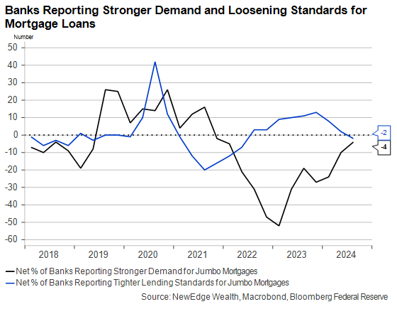 There are some early signs the frozen housing market may be starting to thaw, including in the most recent survey of banks’ lending practices. The Fed’s Senior Loan Officer Opinion Survey (SLOOS) for Q2 showed more banks willing to ease lending standards for homebuyers and more potential buyers showing interest in loans.
