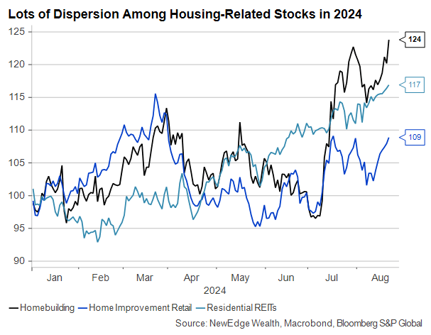 This chart highlights the major housing-related sectors of the S&P 500. Most of the 2024 gains have come during the current quarter as long-term rates have fallen and easier Fed policy has been pulled forward. Homebuilders and Residential REITs are more immediately sensitive to easier financial conditions, while home improvement retailers, who have reported weak consumer demand this year and cut their revenue outlooks, may take longer to fully discount an improvement in the housing market.