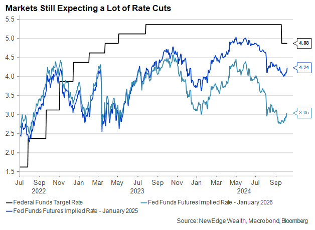 Futures markets still expect a lot of rate cuts from the Fed through the end of 2025, and the Fed’s own forecasts align with this pricing. However, a string of strong employment reports could lead to a reevaluation of that view.