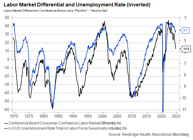 Our investment outlook for 2025 hinges on where we see the state of the labor market – and, by extension, consumer spending. Consumer sentiment polls are lining up with falling quits and hiring rates, with more respondents saying it’s getting harder to find a job.