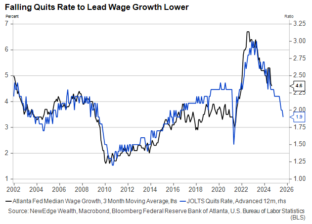 With more workers feeling locked into their current positions, the outlook for wage growth in 2025 is not encouraging. The Great Stay should lead to smaller pay increases over the next year, as the graph below of Quits and Wage Growth strongly indicates. This limits the degree to which price inflation (another lagging indicator) is likely to rise, but both are a symptom of slower growth.