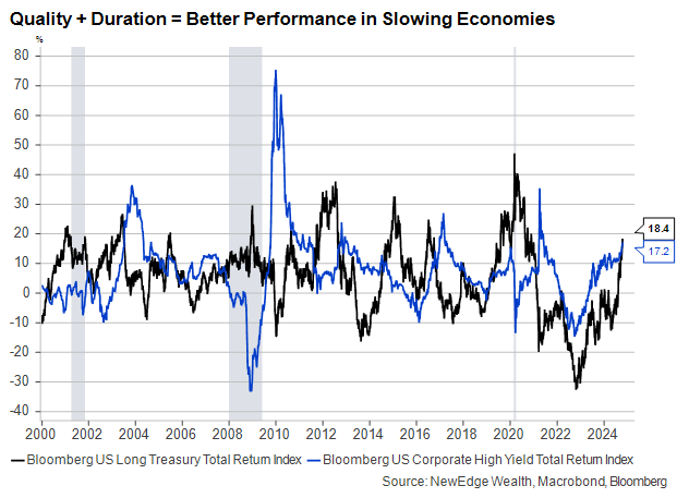 The risk of rising unemployment amid slower growth could have a significant impact on bond markets if these risks materialize. Increasing quality and extending duration are tried and true strategies for navigating periods of high volatility and falling growth rates, with the added benefit that these segments of the market still provide just about their best relative value in the last twenty years.