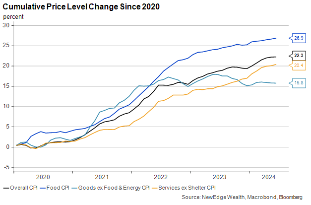 Since the start of 2020, the price level for all goods and services is +22.3% (CPI), while food prices are up +27%, goods prices (ex food and energy) are +16%, and services prices (ex shelter) are +20%.