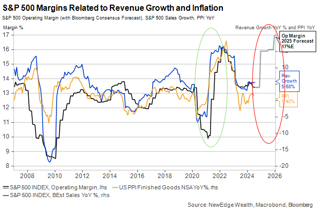 The fascinating point about this chart is seen in the red circle. The gray line represents current consensus forecasts for 2025 operating margins. Note the huge surge up to new all-time highs that is already being baked in to 2025 EPS estimates. This forecast implies that either inflation, pricing power, and revenues surge higher in order to drive margin expansion or that U.S. corporate earnings experience a meaningful surge in productivity.