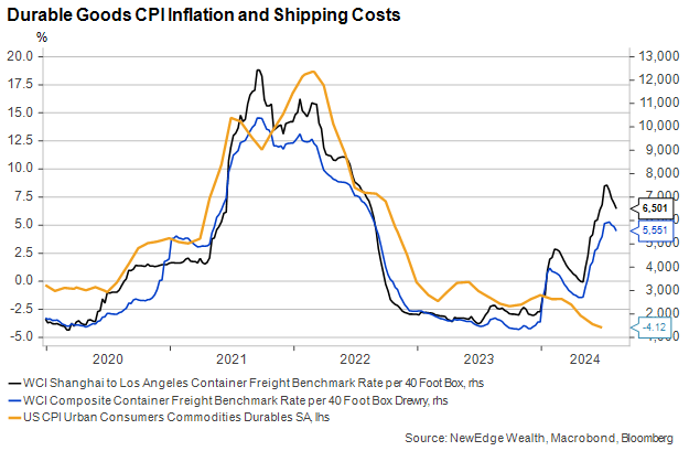 This dynamic is captured in the following chart, which shows ocean shipping costs and durable goods inflation (durable goods are items like washing machines, cars, and furniture). In 2020-2021, as shipping costs soared on supply challenges, durable goods prices rose rapidly. As input cost inflation moderated in 2022 and 2023, durable goods inflation also moderated, going into and staying in outright deflation (a negative reading) since the start of 2023.