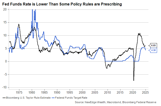 Is there reason to worry that inflation will menace markets again in 2025? Yes, but not as much as there was (with the benefit of hindsight, clearly) in 2022. Fed policy looks only slightly accommodative compared to classic benchmarks like the Taylor Rule, a monetary policy framework that suggests how central banks should adjust interest rates in response to economic activity and inflation: