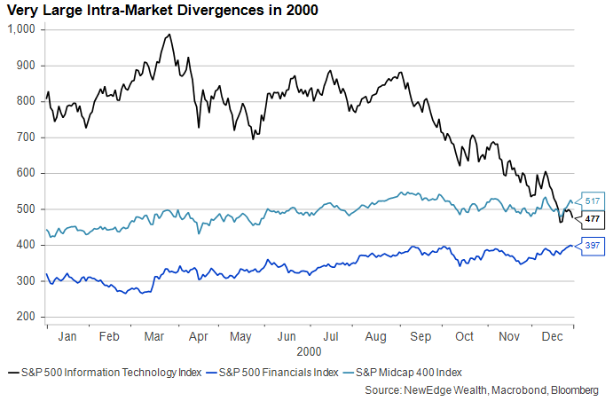 Even before that peak, however, tectonic shifts in the underlying market leadership were taking place. The S&P 500 Technology sector peaked in March, six months before the market, but its initial plunge did little to roil nascent rallies in financials or even mid-cap stocks, both of which finished 2000 with healthy gains: