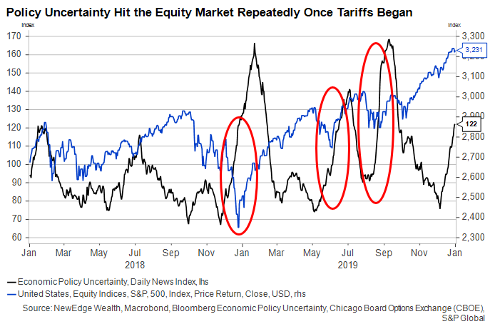 Valuations are also higher today than they were heading into 2018 (12-month forward price-to-earnings ratio of 21.8 vs. 18.3), but interest rates are, as well. The “almost” bear market (a 19.8% S&P 500 correction) that eventually arrived in Q4 came with a swoon in interest rates that helped diversified portfolios amid policy and economic uncertainty. When policy uncertainty is high and growth is under threat, the correlation between stocks and bonds tends to move strongly negative.