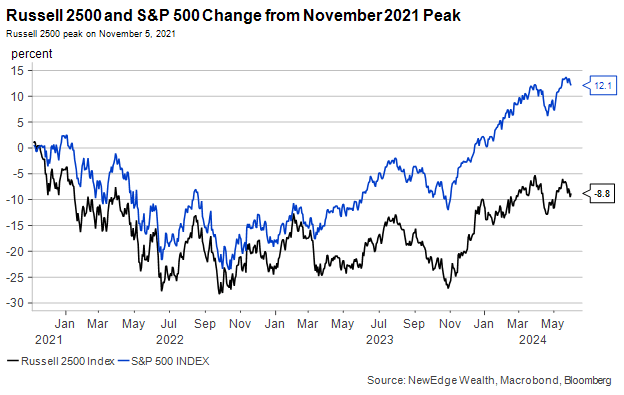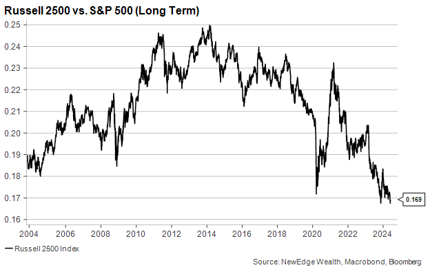 At NewEdge we have recommended investors maintain a bias for large caps over small and mid-cap equities since 2021, a stance we reiterated at the beginning of this year, despite the widely held consensus view that 2024 would be the year that small and mid-cap equities would finally come around.