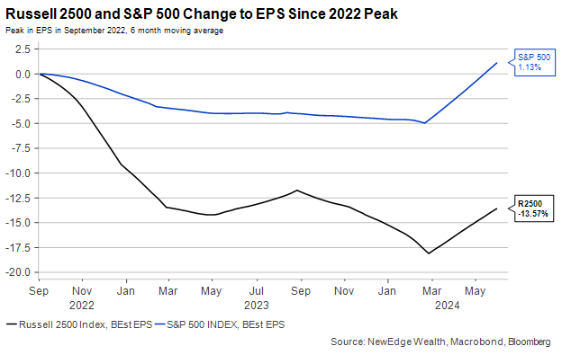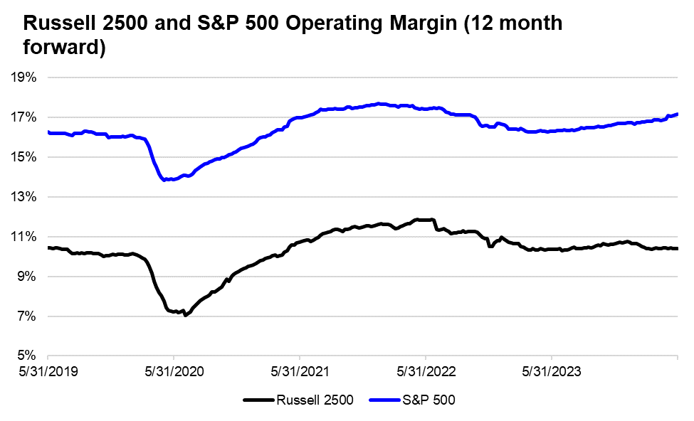 • The main culprit behind this earnings weakness has been declining profitability as aggregate operating margins in the index have shrunk from over 9% to just 6% over the past two years, offsetting revenue growth of more than 15%, largely a result of increased wage and interest expenses. For SMID cap performance to rebound, better margin performance is likely required (currently this recovery in profitability is anticipated as illustrated in the below chart), while the silver lining to the recent weak performance is that it creates easy comparisons growth going forward. Interestingly, we may see the inverse effect in the large cap segment as tougher YoY comparisons could weigh on future earnings growth, especially in the largest index constituents, which have delivered incredible EPS growth in the past two years but are expected to see a marked deceleration in this growth in 2025.