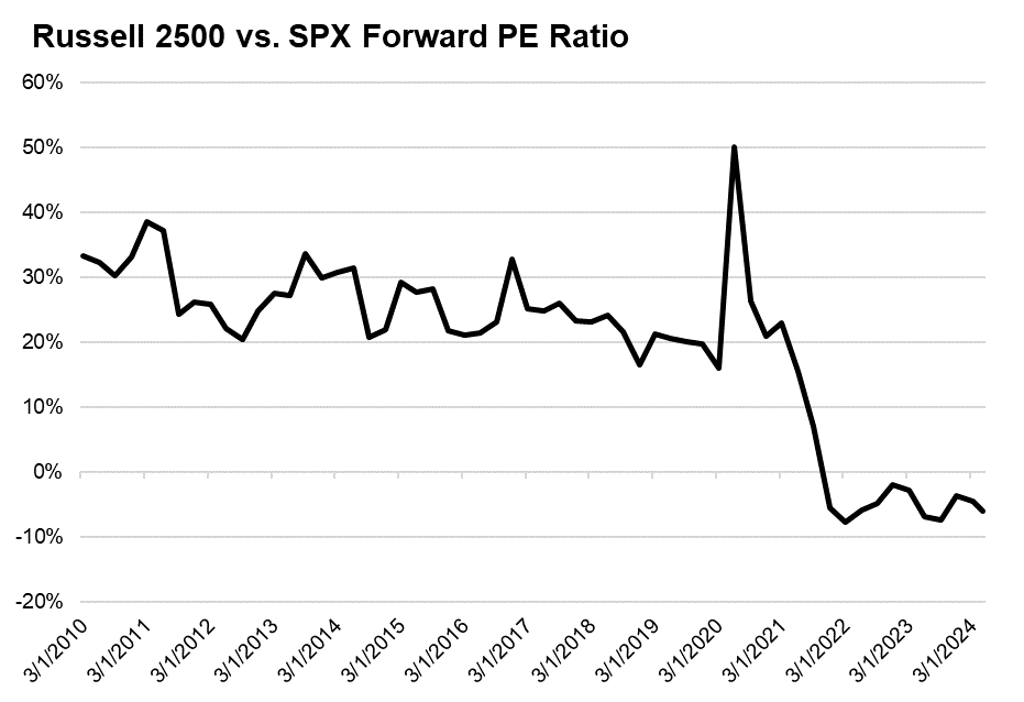 While valuation is typically a poor market timing tool, we acknowledge that there remains an opportunity to invest in the SMID segment at more attractive valuations than large caps especially when factoring in currently depressed and potentially reaccelerating earnings. The U.S. large cap segment, measured by the S&P500, currently trades at 19x 2025 earnings estimates, 5% above its 10-year average forward P/E, while the Russell 2500 Index currently trades at 16x 2025 earnings estimates, a 20% discount to its 10-year average forward P/E. We see a similar story in Price to Book Value metrics, as the Russell 2500 Index currently trades at 2.3x Book Value, in line with its 10-year average, while the S&P500 currently trades at a near record 4.8x Book Value, a 30% premium to its 10-year average.